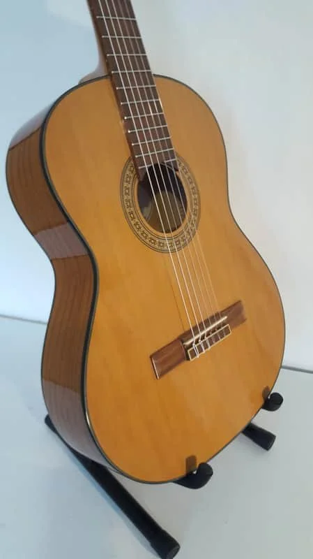 Cavarlo Classical Guitar GC-4000 is a full size quality guitar in High Gloss natural color. Made with high quality materials like: Spruce top, Mahogany Walnut back and sides, Ebony fretboard, and Mahogany neck and bridge. Made by Antonio Carvalho to Fletted Instruments Craftsman in Portugal with traditional methods. Plays nicely and sound really good.